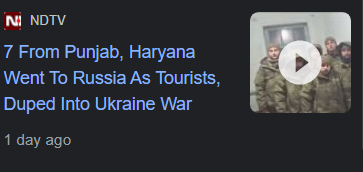 {% embed url="<https://www.ndtv.com/india-news/russia-ukraine-war-indians-tricked-into-fighting-ukraine-war-punjab-men-7-punjab-men-say-they-went-to-russia-as-tourists-tricked-into-ukraine-war-5181831>" %}